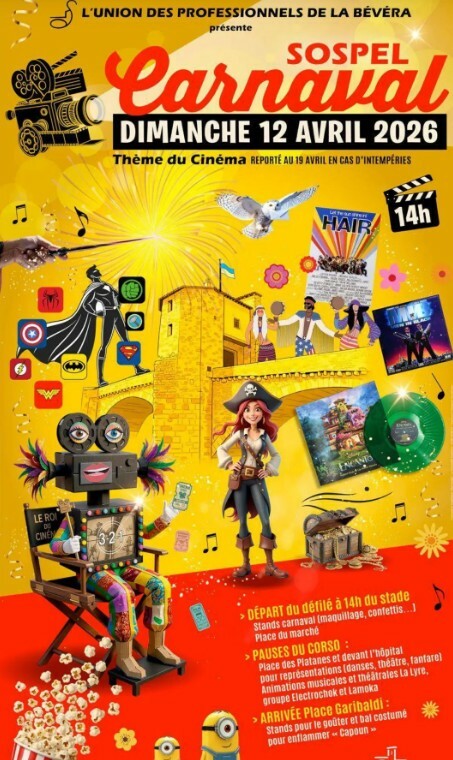 A Sospel torna il Carnevale a tema cinema, un appuntamento che unisce tradizione e folclore alla magia della settima arte. L’evento si terrà domenica 12 aprile allo Stade municipal, a 350 metri di altitudine, offrendo anche una piacevole vista sul paesaggio circostante e un pomeriggio di divertimento.