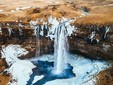 L’acqua scende con precisione quasi geometrica da una parete rocciosa verticale, creando un velo compatto e continuo che sembra separare terra e cielo. Una scalinata laterale conduce fino alla sommità della cascata, da cui si apre un panorama vasto e suggestivo sulle pianure islandesi.