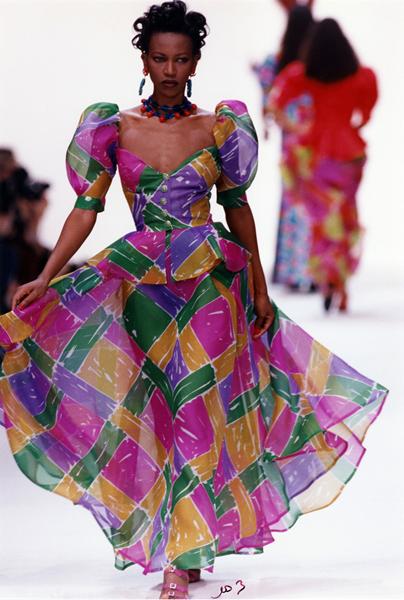 Yves Saint Laurent, ensemble de soir porté par Amalia Vairelli Collection SAINT LAURENT rive gauche printemps-été 1994. Cour du Louvre, Paris, octobre 1993 Musée Yves Saint Laurent Paris Photo © Guy Marineau