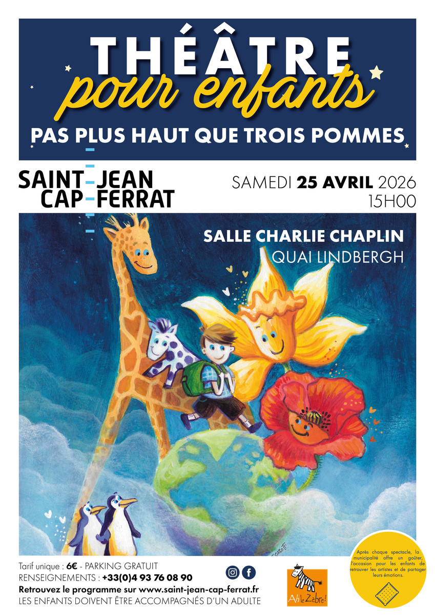 Andrà in scena sabato 25 aprile 2026 alle ore 15.00, presso la Salle Charlie Chaplin di Saint-Jean-Cap-Ferrat (Quai Lindbergh), lo spettacolo per bambini “Pas plus haut que trois pommes”, una produzione della compagnia Ah le Zèbre ! firmata dall’autore Thierry de Pina.