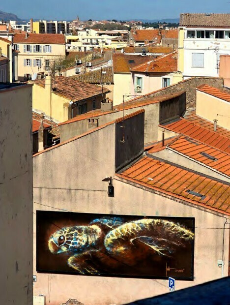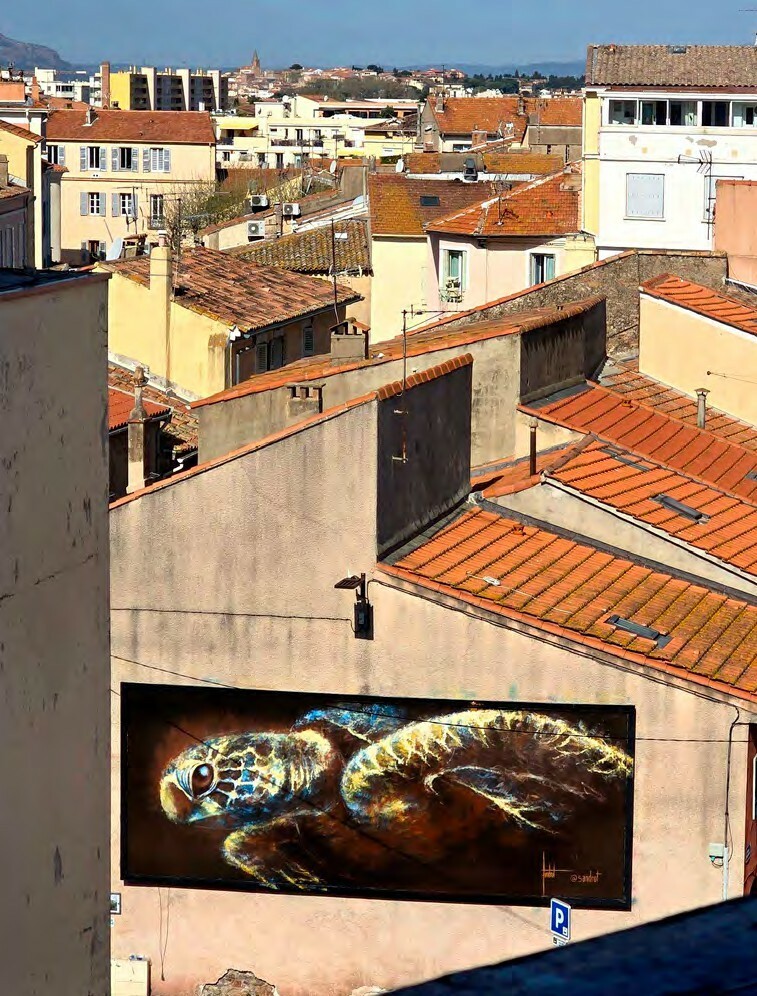 Anche nell’ambito dell’arte urbana, Sandrot ha lasciato un segno significativo, realizzando opere murali per importanti realtà come l’Aquarium de Paris, la Réserve Africaine de Sigean, il Parco Naturale Regionale dell’Haut-Languedoc e le città di Tolosa, Marsiglia e La Rochelle.