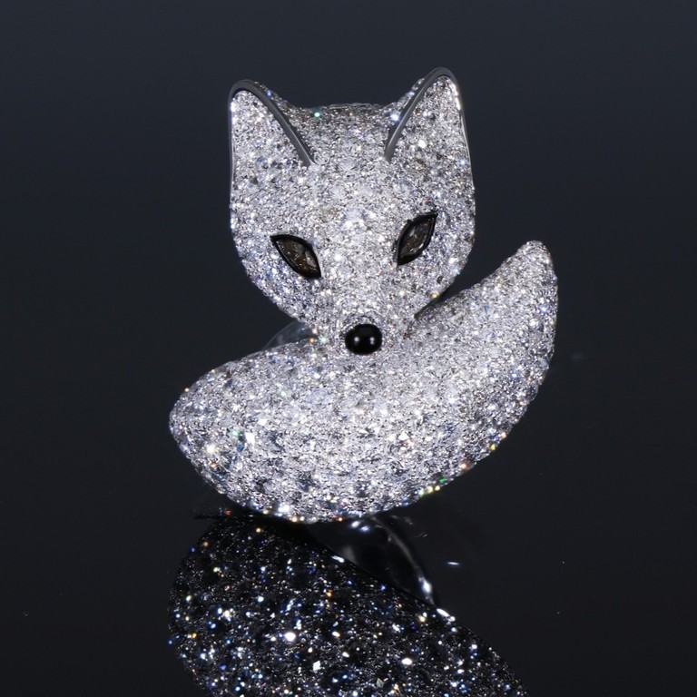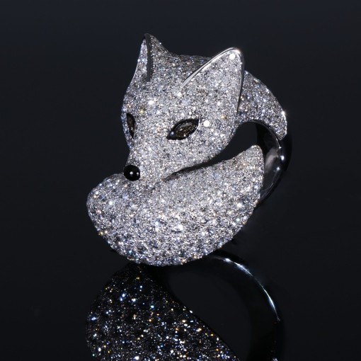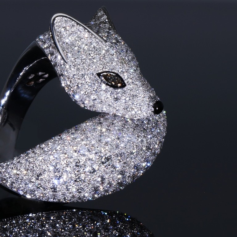 L’anello nasce dall’incontro tra l’estro creativo di Davide Currado ed il Maestro modellista Francesco Baglioni, dando vita ad una creazione che esprime movimento e armonia. La volpe si sviluppa in una linea avvolgente, con il corpo raccolto e fluido, quasi a proteggere sé stessa. Un’impronta stilistica che conferisce al gioiello un carattere intimo e al tempo stesso scenografico, capace di distinguersi con eleganza assoluta. Straordinaria la lavorazione del pavé composto da centinaia di diamanti, incastonati con precisione estrema, rivestono l’intera superficie creando un effetto luminoso, intenso e vibrante. La luce non si limita a riflettersi, ma sembra scorrere lungo le curve della volpe, esaltandone ogni dettaglio. Lo sguardo, definito da due diamanti fancy brown, aggiunge profondità elevando l’animale a presenza viva, percorsa da un respiro invisibile.