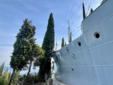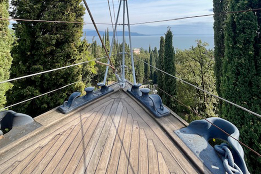 La prua della nave Puglia spunta tra gli alberi, incastrata nella collina. Storica protagonista della Prima Guerra Mondiale, donata al poeta dalla Marina Militare. Non una riproduzione, non una citazione: una nave reale, sospesa tra terra e cielo, orientata verso la riva come se fosse pronta a salpare. È un’immagine che spiazza, che interrompe ogni logica. Non si capisce subito. E forse non si deve capire. È teatro puro! D’Annunzio non conserva il passato: lo trasforma in gesto. Non racconta la guerra: la rende tangibile. Ogni elemento qui ha questo scarto. Ogni dettaglio è più intenso, più dichiarato, più definitivo.
