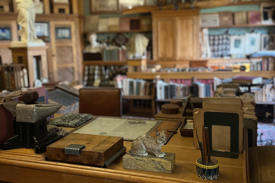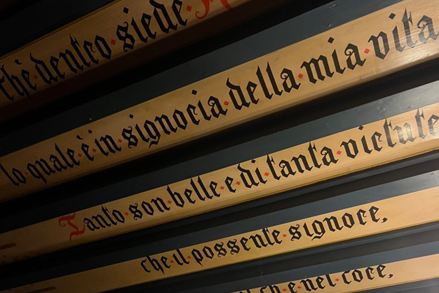 Poi si entra nella casa e la luce si abbassa, quasi scompare. Gli spazi si stringono. Gli occhi impiegano qualche secondo ad abituarsi, ma nel frattempo si percepisce già qualcosa di preciso: la densità. Non c’è mai il vuoto: libri ovunque, tappeti sovrapposti, tavolini, statue, reliquie. Ogni superficie è occupata, ogni angolo è saturo. Non esiste un punto in cui lo sguardo possa annoiarsi. Tutto chiama attenzione, tutto chiede di essere guardato in profondità. Eppure non c’è caos ed è questo il dettaglio più sorprendente. Ogni oggetto è lì per una ragione. Ogni disposizione è studiata, c’è un ordine invisibile. D’Annunzio costruisce lo spazio come costruisce sé stesso: per accumulo, per intensità e per eccesso. Ma senza mai perderne totalmente il controllo!