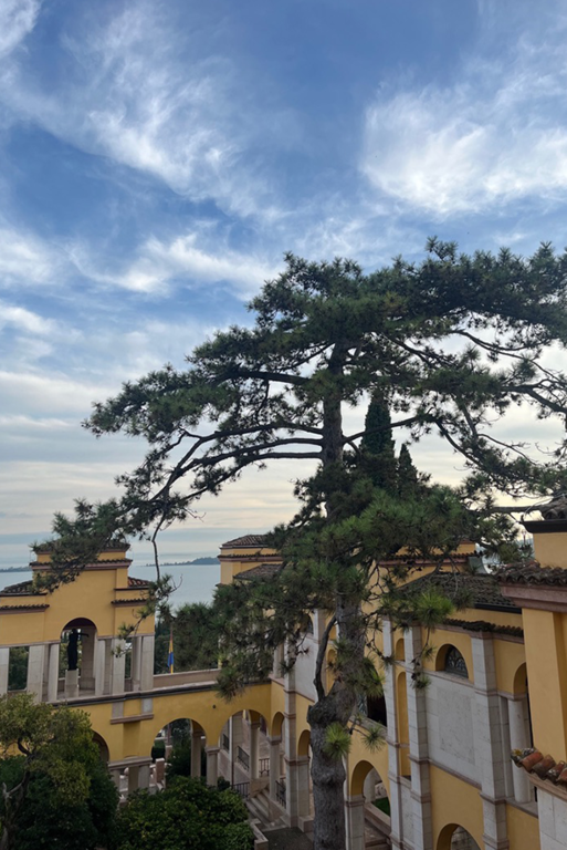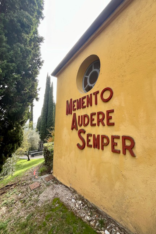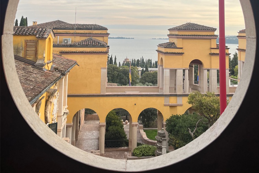 Più in alto, l’anfiteatro riapre lo spazio e il lago torna protagonista. Anche qui, la prospettiva è scelta, calibrata, guidata. Questo luogo non abbandona mai se stesso. Ed è ciò che resta! Non tanto la bellezza, che pure è evidente. Non la grandezza, che è impossibile ignorare. Ma la coerenza, una coerenza totale, radicale. D’Annunzio non ha semplicemente abitato questo luogo. Lo ha costruito come estensione diretta della propria identità. Ha eliminato ogni distanza tra vita e rappresentazione. Ha fatto della sua esistenza un’opera d’arte. Non ha costruito un luogo da capire, ma da sentire. Non un percorso da concludere, ma un’esperienza da lasciare aperta, irrisolta. Come se tutto fosse ancora in atto, anche adesso, anche senza di lui.