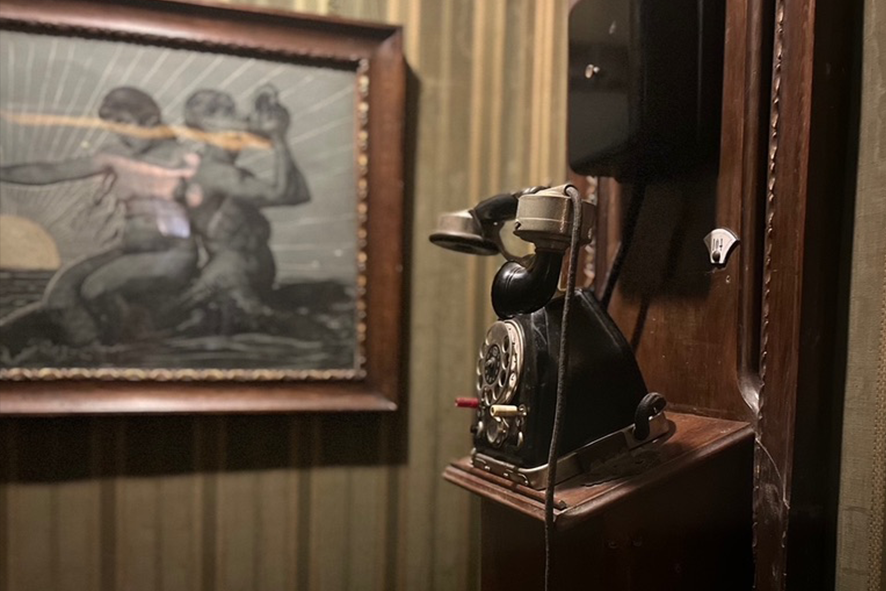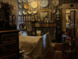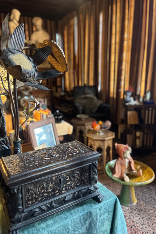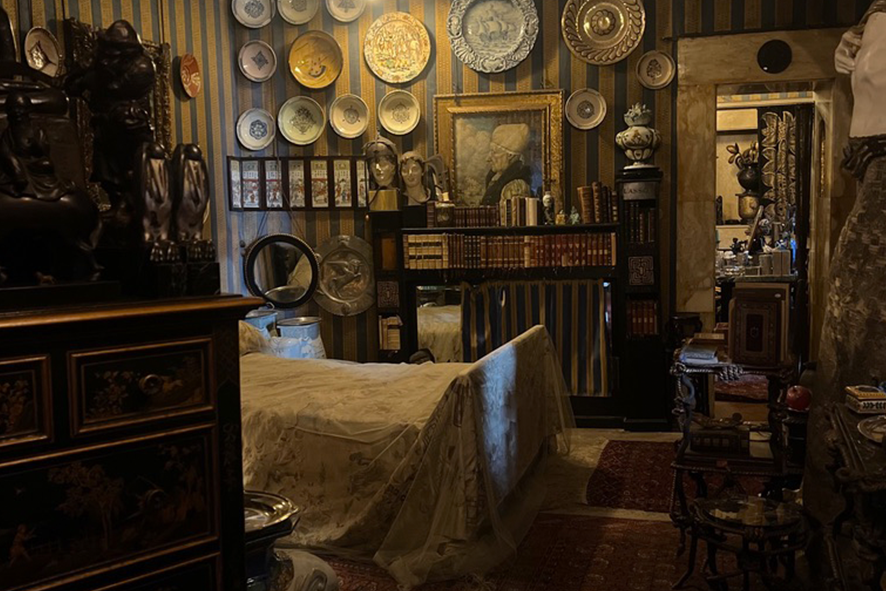 Nelle altre stanze una miriade di oggetti stravaganti e provenienti da Paesi lontani. Poi piccole e grandi fotografie incorniciate, frammenti personali che sembrano cercare spazio dentro una narrazione troppo grande per contenerli davvero e tanti accessori di ogni genere. C’è anche un telefono incassato nella parete, isolato, quasi fuori contesto. Si cammina lentamente, quasi in silenzio, non solo per rispetto, ma perché lo spazio ristretto lo impone. La casa non è un rifugio. È una dichiarazione al mondo. È come se ogni stanza avesse un peso specifico, una storia da raccontare.