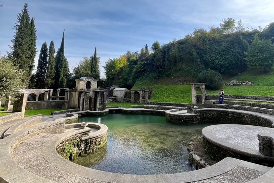 E quando si esce, l’aria sembra più leggera. Ma è solo un’impressione. Perché l’atmosfera del Vittoriale continua. La natura è guidata, piegata, trasformata in elemento scenico. Il Laghetto delle Danze compare quasi senza preavviso. Una vasca circolare, perfetta, silenziosa. Non è una vera piscina. E non è un semplice elemento decorativo. È uno spazio pensato per il movimento e per il corpo. C’è una tensione sottile, come se il luogo trattenesse una memoria fisica: gesti, passi, presenze soprattutto femminili.
