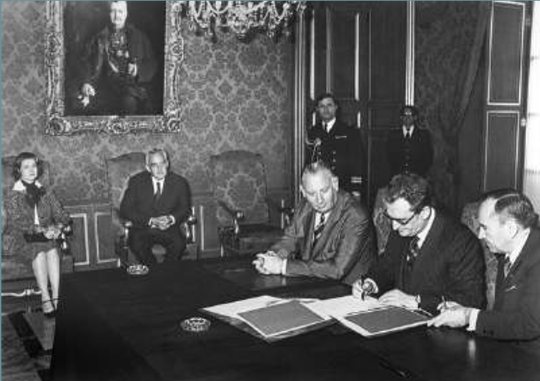 Michel Poniatowski, ministro di Stato francese responsabile dell’Interno, Mario Pedini, ministro italiano della Ricerca scientifica e dei beni culturali e ambientali, e André Saint-Mleux, ministro di Stato del Principato, firmano l’Accordo RAMOGE il 10 maggio 1976, nella sala del trono del Palazzo del Principe, alla presenza del Principe Rainier III e della Principessa Grace.