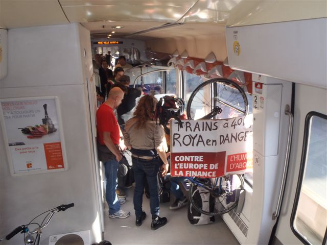 In val Vermenagna i Sindaci ci hanno atteso alle fermate, in val Roya si sono concentrati a Breil dove il cambio di treno ha dato il tempo di ballare le courento e i balet direttamente a fianco dei binari. Preso il treno per Nizza, altro concentramento di Sindaci a L'Escarene.